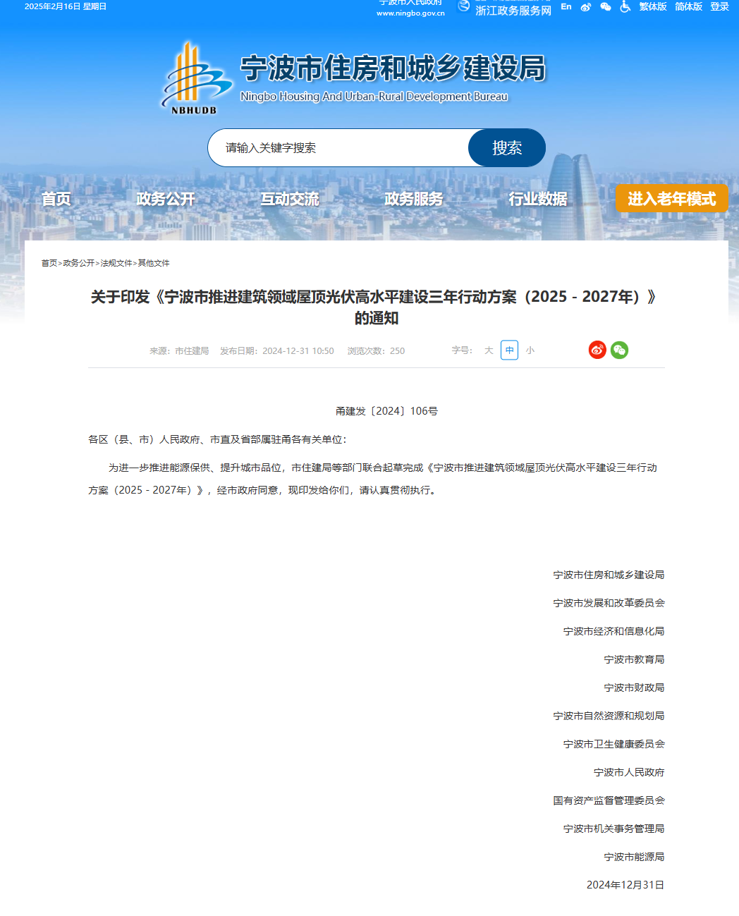 日前,浙江省宁波市住建局、市发改委、市经信局等11个部门联合印发了《宁波市推进建筑领域屋顶光伏高水平建设三年行动方案(2025-2027年)》。